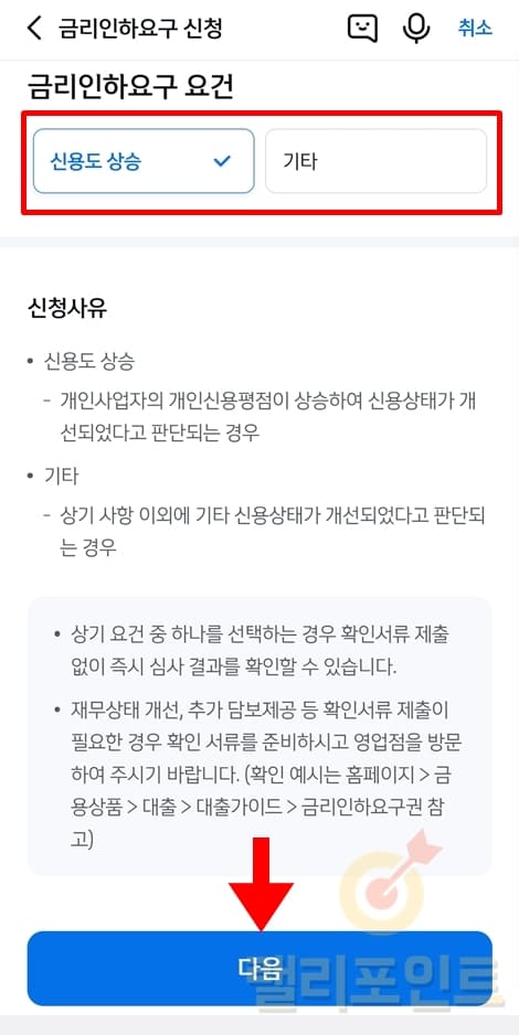 8. 금리인하요구 요건에서 신용도 상승 또는 기타를 선택합니다.