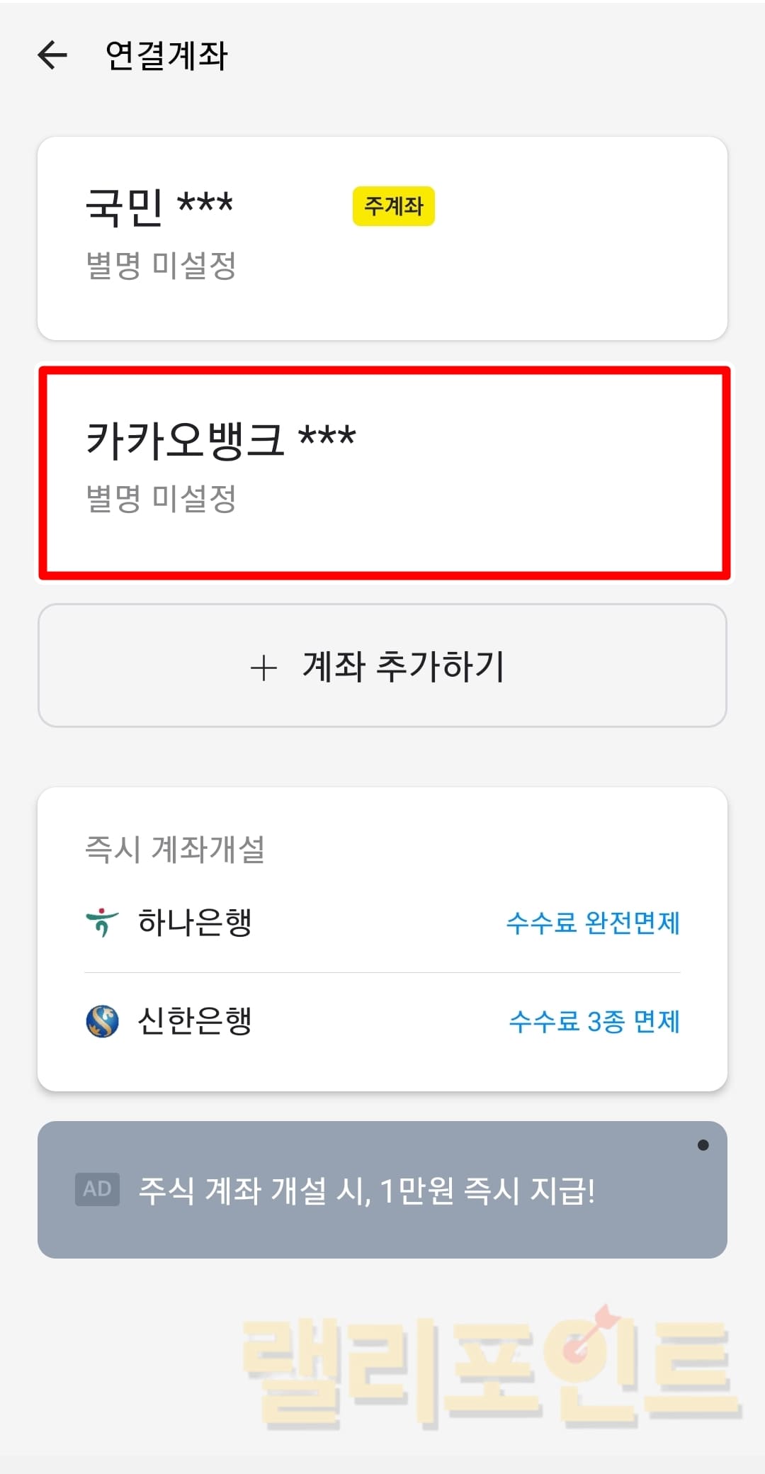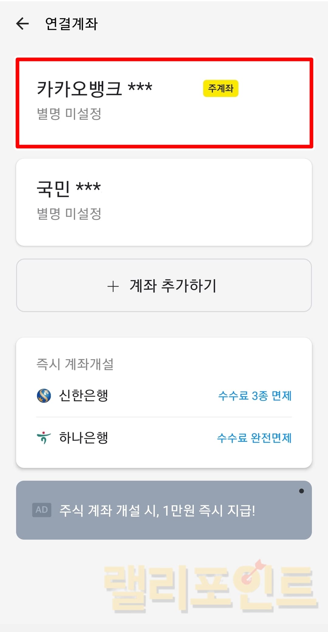 만약 주계좌를 제외한 다른 연결계좌가 아래 목록에서 보여진다면 계좌를 새로 추가하지 않고 바로 클릭하여 변경도 가능합니다.