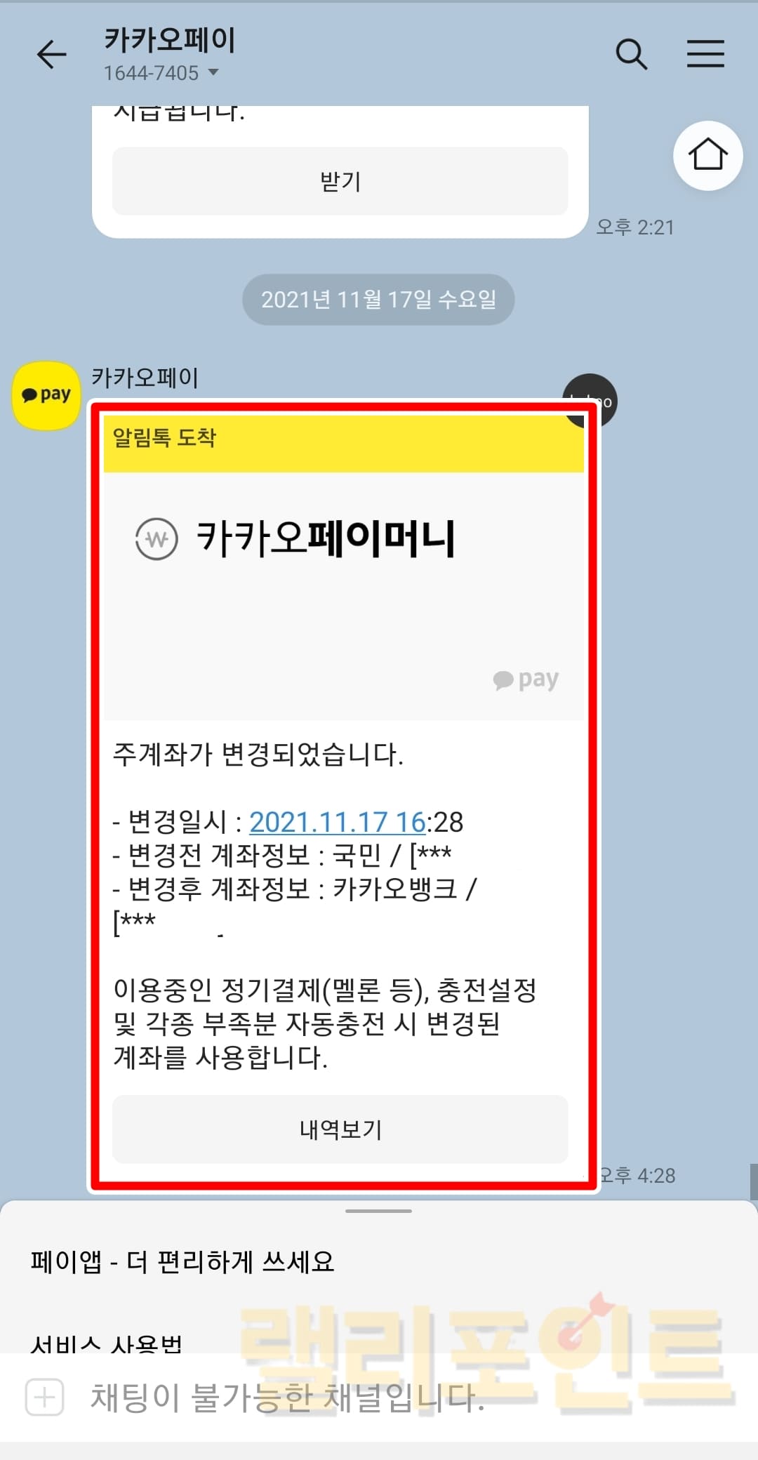 카카오페이 주계좌 변경 안내 메시지도 확인할 수 있습니다. 변경일시, 변경전 계좌정보와 변경 후 계좌정보를 볼 수 있습니다. 이제 이용중인 정기결제 (멜론, 자동충전)이나 부족한 분의 카카오페이 충전시 변경된 계좌를 사용하게 됩니다.