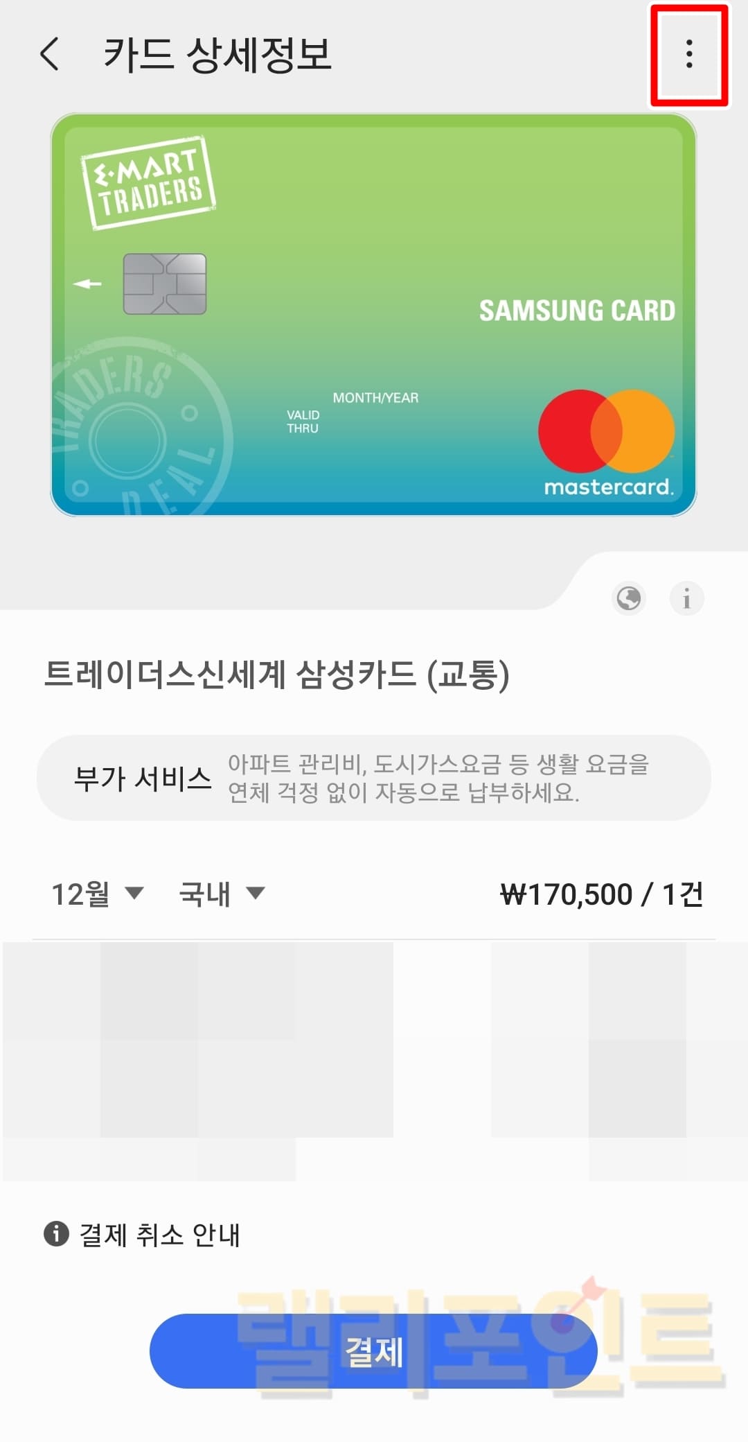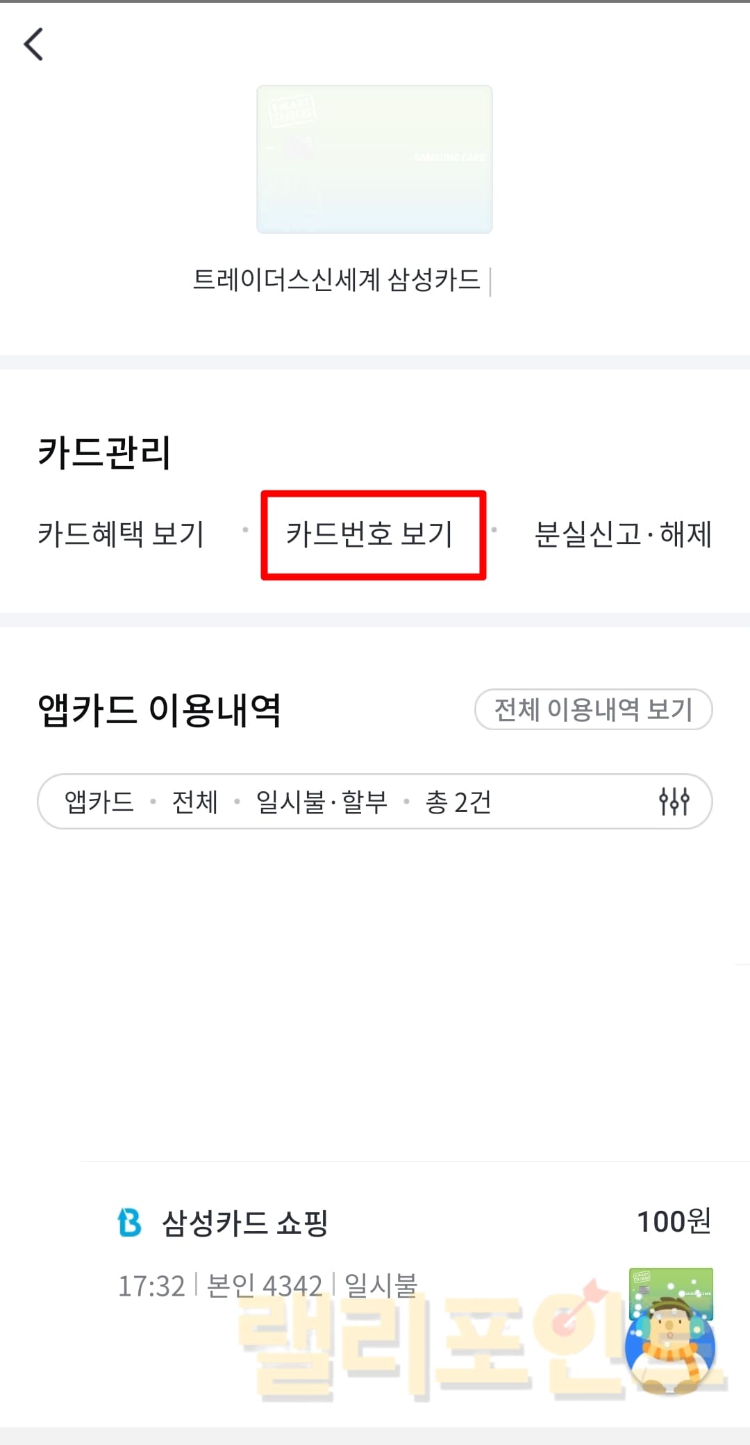 삼성페이카드가 아닌 국민, 신한, 하나, 우리, 삼성 등의 카드는 삼성페이에 등록이 되어 있다고 해도 카드번호 확인이 불가능합니다. 그래서 카드의 더보기 버튼을 눌러도 '카드 번호 보기' 메뉴가 지원되지 않습니다. 그래서 스마트폰에서 카드번호 확인을 위해서는 해당 은행상의 카드 앱에서 조회가 가능한데요. 아래에서는 가입자가 많은 대표적인 국민카드와 삼성카드의 카드번호 조회 방법을 함께 소개드리도록 하겠습니다.